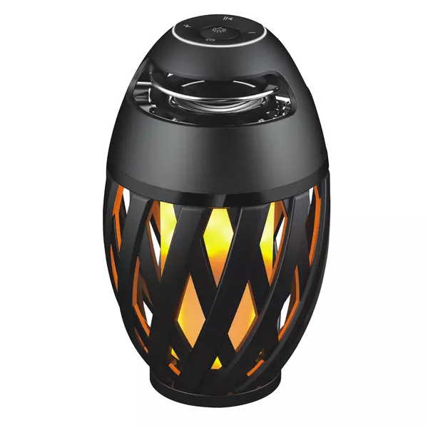 Flammelampen har en realistisk og flott dansende flamme. Høyttaleren på 5 watt kobles enkelt opp mot din mobiltelefon, og du kan spille musikk i hagen, på camping, i båten, eller på hytta. Leveres med oppladbart batteri som vil virke i 7,5 time ved bruk av både lys og høyttaler funksjon, inntil 30 timer med bruk av kun lys. Ladetiden er på ca. 4 timer. Produsert i robust ABS-materiale.